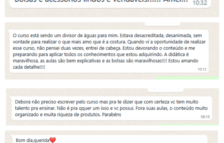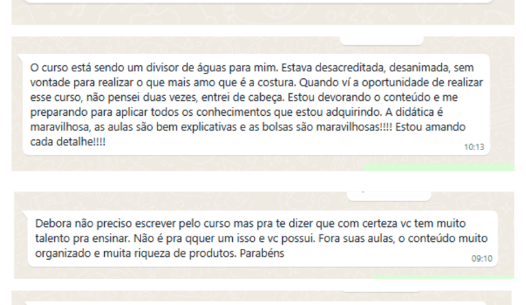 Me chamo Debora Moraes sou casada e mãe da Maria Clara, costureira e apaixonada pela costura criativa!Tenho uma forte ligação com artesanato desde criança. Comecei a costurar depois que minha filha (Maria Clara) nasceu, como uma fonte de renda após perder meu trabalho CLT como secretária médica, e aos poucos, descobri um grande amor! Um potencial de trabalho e de ganhos para ajudar na renda da minha família. E assim, de um jeito simples, nasceu o meu ateliê - onde comecei a divulgar minhas peças autorais, no início com peças para maternidade. Com esse trabalho, muitas pessoas começaram a me pedir dicas e sempre me alegrei muito em auxiliar e ensinar essas mulheres (minhas amigas do feito à mão como gosto de chamar rs) a se desenvolverem dentro da costura criativa, aumentando suas vendas e construindo um ateliê de sucesso.