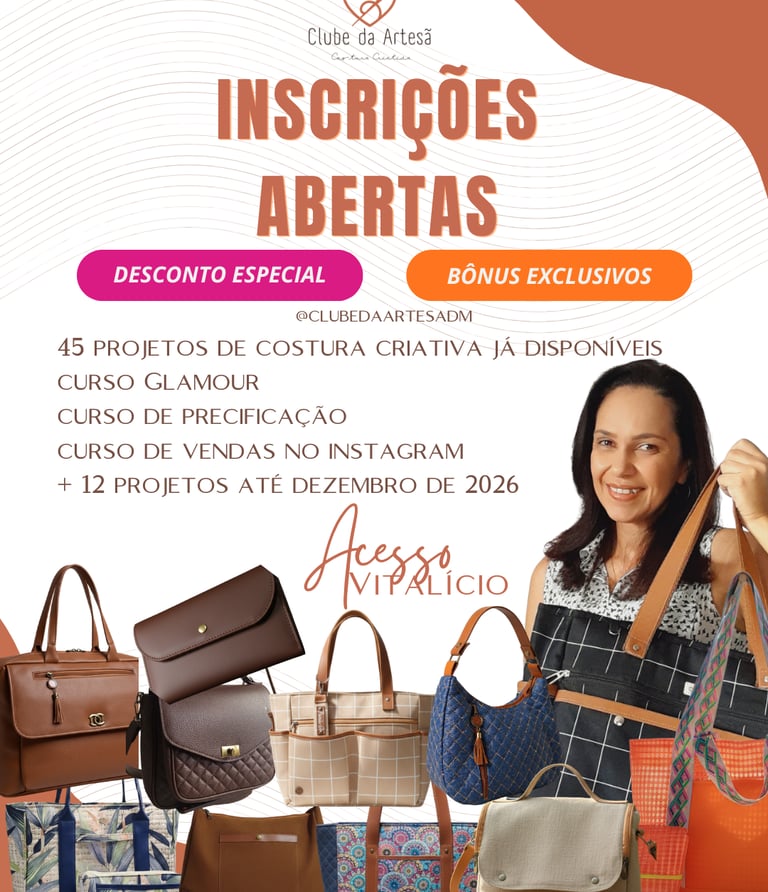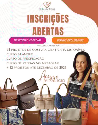 Se você quer trabalhar com materiais sintéticos de luxo e criar bolsas que parecem ter saído de uma vitrine de grife, este é o seu momento. O Curso Glamour foi pensado para quem deseja ir além do básico e entregar verdadeiras obras de arte para suas clientes.